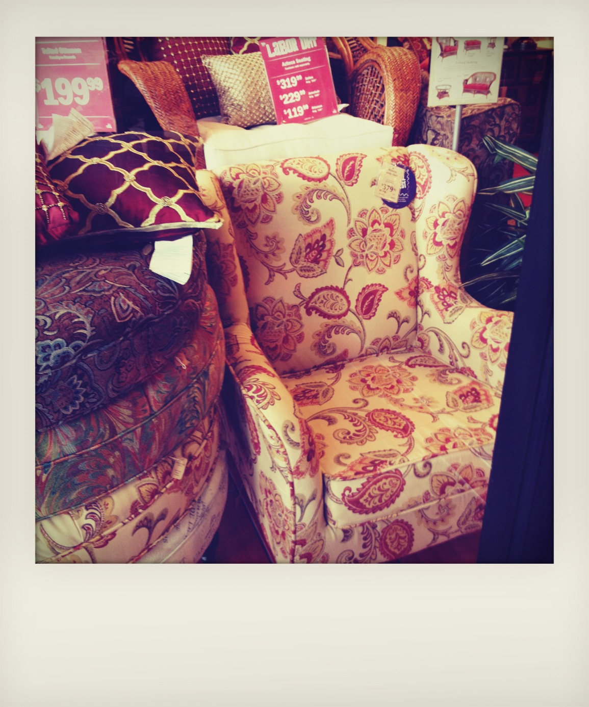 Nun, ich komm nicht wieder. Ich lade mir am Morgen eine neue Foto-App auf mein iPhone, die absolut geeignet ist, damit die Umgebung zu erkunden. (Merke: aus hässlichen Dingen kann man immer noch Kunst machen). Bevor es wie verrückt zu schütten beginnt, mache ich also eine kleine Tour um das Hotel, das wie eine Insel auf einem Parkpatz liegt, der fast die gleiche Grundfläche einnimmt. Und ihr dachtet, ich bin im Paradies, nicht? Auf der nächsten Insel sind ein paar Geschäfte, das Übliche: Diner, Starbucks, ein Möbelladen. Moment mal – ich seh‘ da was, da muss ich rein. Denn hier sind sie endlich! Die Sessel, die bei Starbucks immer rumstehen, und die man in Deutschland nirgendwo kaufen kann! (Wir haben es versucht). Das gibt es doch nicht. In allen Größen und Farben und Formen. Die will ich haben. Kurze Überlegung, ob ich mir einen Sessel kaufe. Na? 20 % off Labor-Sale und dann noch Sommerschlussverkauftsrabatt und wenn ich mir noch eine Store-Karte hole – fast geschenkt. Bleibt nur die Frage, wie ich das Ding nach Hause bekomme …