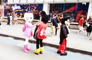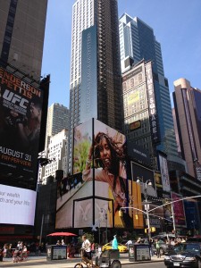 Seit ich als sehr kleines Mädchen in Berlin auf dem Ku-Damm von einem großen Bären mit Berlinschärpe begrüßt worden bin, habe ich ANGST vor lebendigen Souveniers. Gut, aber das gehört vielleicht nicht hierher. Denn ansonsten bin ich und war ich auch diesmal wieder absolut fasziniert vom dem zu viel, zu groß, zu bunt an dieser Stelle von New York. Es ist wie Weihnachten als Kind, man war so klein, der Baum so groß, und bunt und alles glitzerte. Boah! Über die Jahre wird man größer – vielleicht der Baum auch kleiner – und am Ende lächelt man nur noch lässig – Been there, done that. Aber am Time Square … jedes Mal das Gleiche. Man biegt um die Ecke, sieht die Lichter und – BOAH. Selbst jeder Lastwagen und jedes Taxi sieht auf einmal nur noch wie ein vergrößertes Spielzeug aus. WOW. Ich glaube, das ist es. Und nur darum geht es hier. Hat das mit Kunst zu tun? Naaa, eher nicht. Mit Leben? Nope. Schon gar nicht. Das ist einfach nur Show. Tada! – Enjoy.